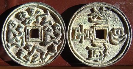 On note sur la pièce de droite deux serpents (ou deux dragons) qui font la liaison entre le ciel et la terre, comme le caducée.